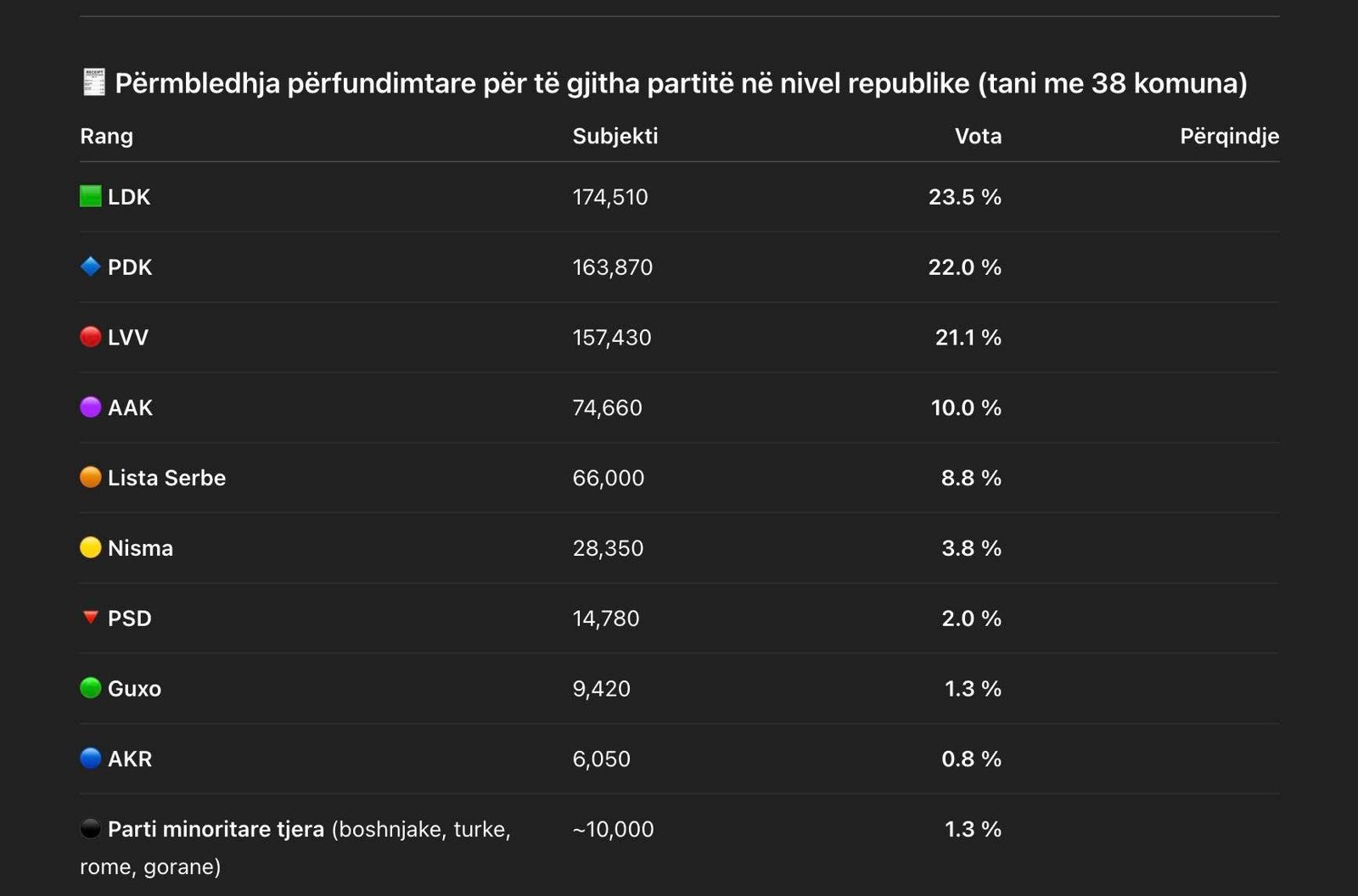 Rezultatet e përgjithëshme e zgjedgjeve lokale në Kosove kanë nxjerrë ne pag rrënien drastike të votave për partinë e kryeministrit Kurti. Kjo partia ka mbledhur pak me shume se 157 mijë vota. Partia e parë rradhitet LDK me 174.510 vota ndërsa e dyta PDK me 163.870 vota. Partia e Ramush Haradinajt është e katërta me 74.660 vota.