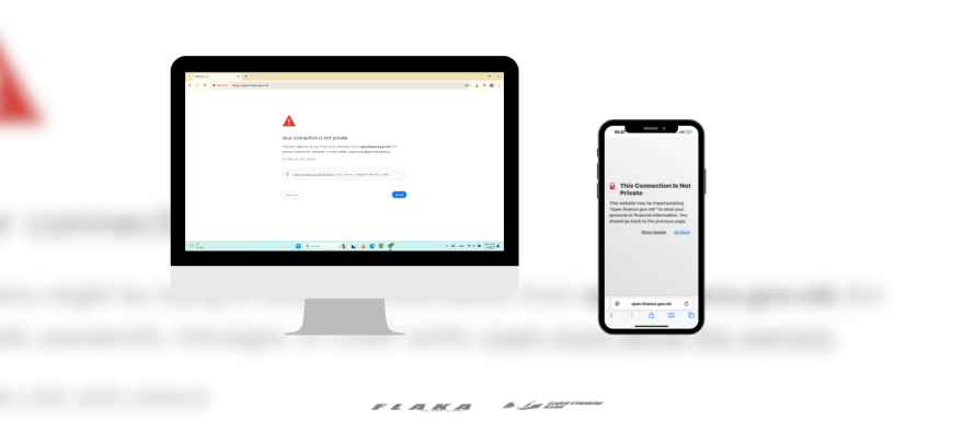 “Faqja nuk u gjet. Kjo lidhje nuk është private. Ky uebsajt mund të jetë duke u shtirur si ‘open.finance.gov.mk’ me qëllim që të vjedhë të dhënat tuaja personale ose financiare. Ju rekomandohet të ktheheni në faqen e mëparshme”.