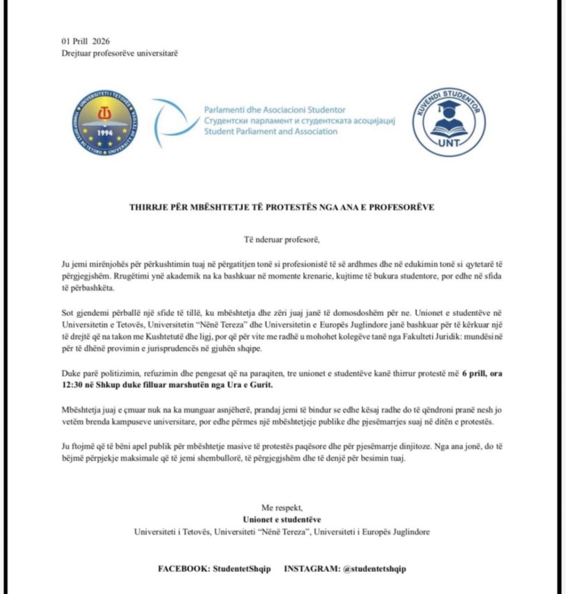 Unionet e studentëve nga Universiteti i Tetovës, Universiteti “Nënë Tereza” dhe Universiteti i Evropës Juglindore kanë dalë me një thirrje publike drejtuar profesorëve universitarë, duke kërkuar mbështetje për protestën në Shkup e paralajmëruar më 6 prill, në ora 12:30.
